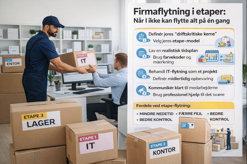 Firmaflytning bliver ikke kaos, fordi folk er dumme. Den bliver kaos, fordi processen bliver undervurderet, og fordi små ting (mærkning, IT, plan, adgang) skaber store problemer, når de ikke er på plads.