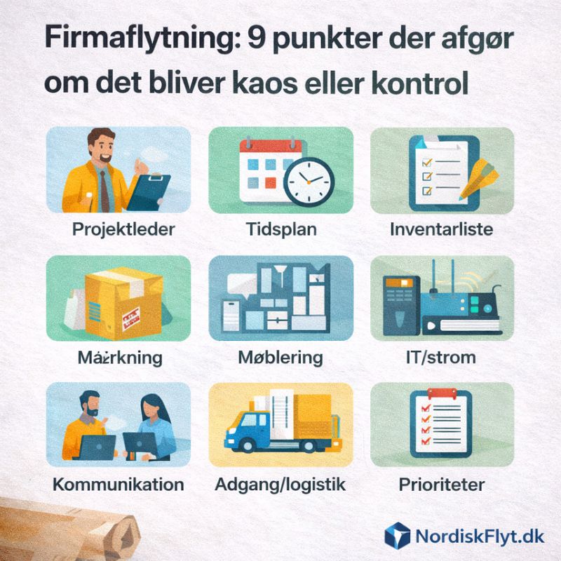 Her får du 9 punkter, der i praksis afgør, om jeres firmaflytning bliver en professionel proces eller en dyr kaos-fortælling, som I kommer til at nævne i årevis.